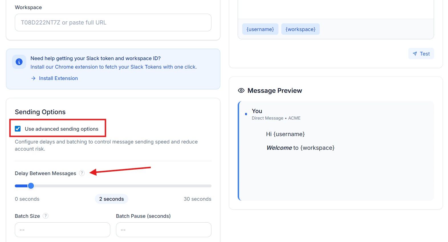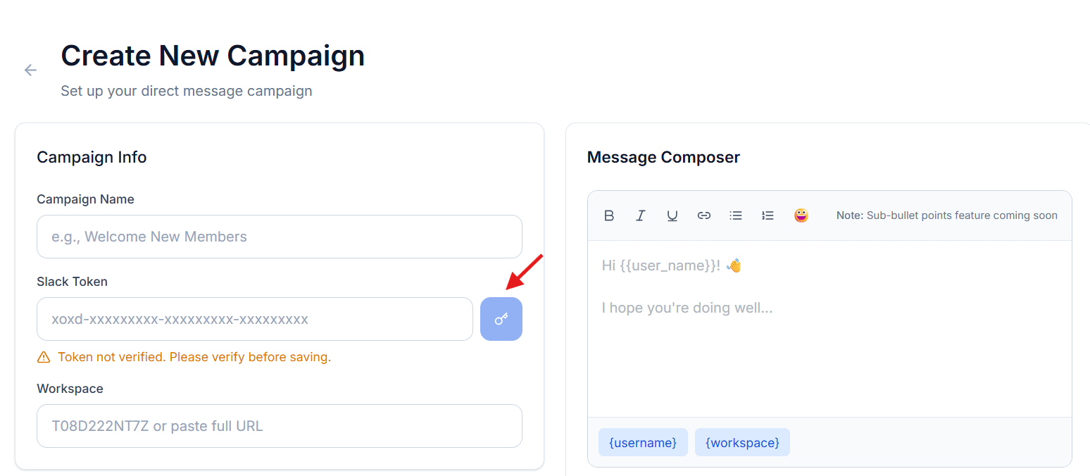 Add your campaign name, paste the token & workspace ID you fetched from the extension, and you’re ready to compose your message.