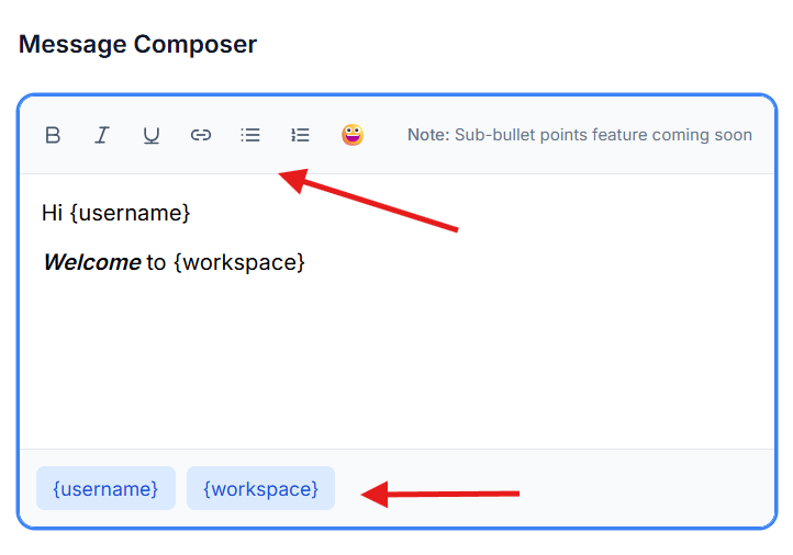 Make every message feel personal. Use tags like {username}, {first_name} or {workspace} to automatically insert real user details.