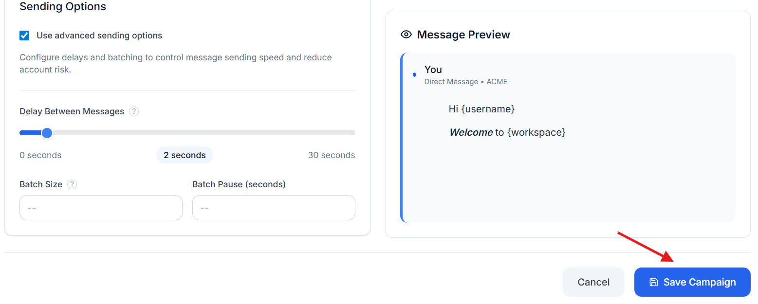 Create new DM campaigns in seconds. Verify your workspace token, add workspace ID, write your message, and you’re ready to go.