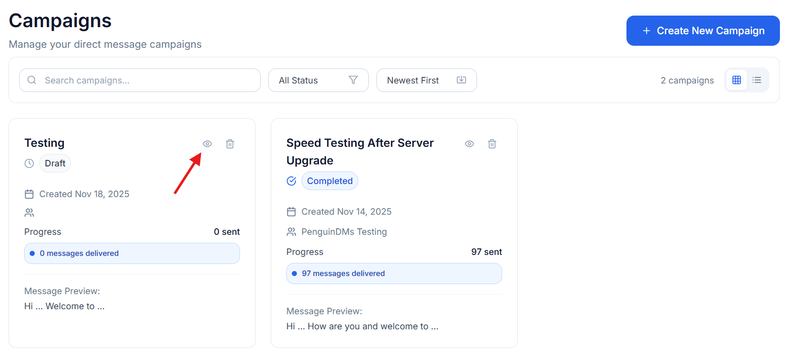 From the campaigns list, click the eye icon to open your campaign details and controls.