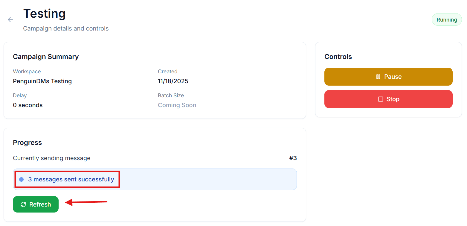 Watch how many messages have been sent and use Pause or Stop anytime.